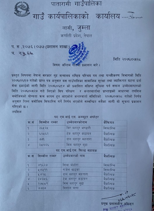 एम आई एस् अपरेटर र फिल्ड सहाय पदकाे अन्तिम नतिजा प्रकाशित