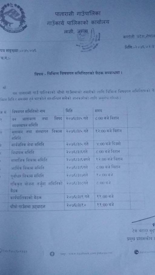 पातारासी गाउँपालिकाको चौथो गाउँसभा तथा विषयगत समितिहरुको बैठक सम्बन्धी जरुरी सूचना