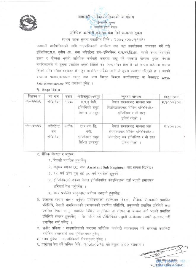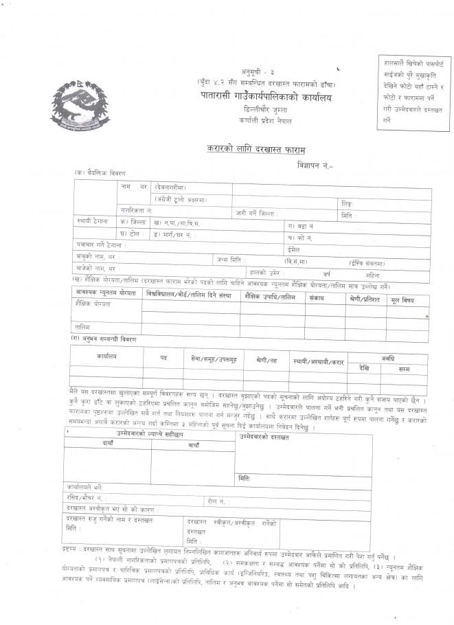 प्राविधिक कर्मचारी करारमा भर्ना लिने सम्बन्धी सूचना र दर्खास्त फाराम