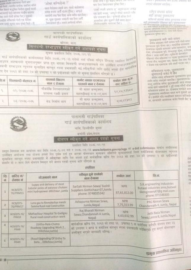 » बोलपत्र स्वीकृत गर्ने आशय पत्रको सूचना